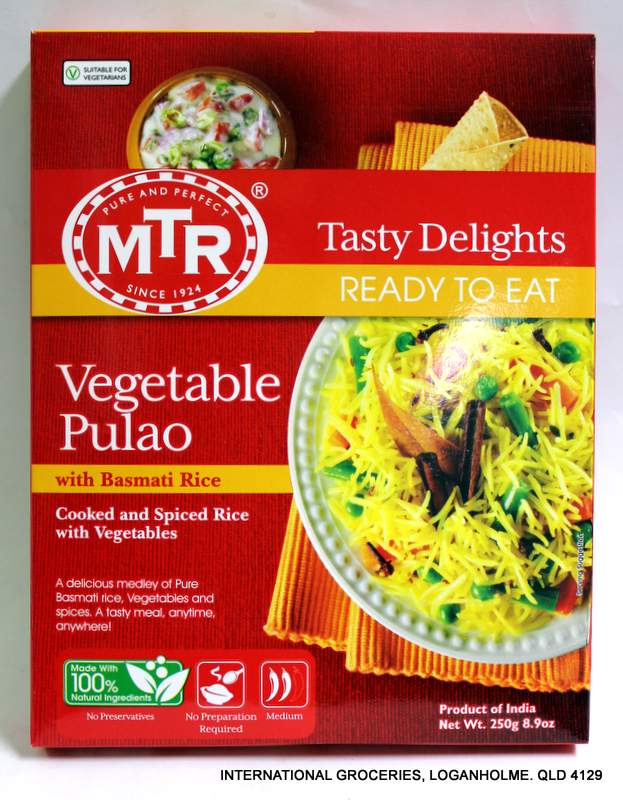 Ingredients: Water, Rice (38%), Peas (5%) Carrot (4%), Beans (2%), Onion Paste,Ghee (Clarified butter), Salt, Garlic Paste, Turmeric, Refined Sunflower Oil, Mixes Spices, Green Chilli Paste.
